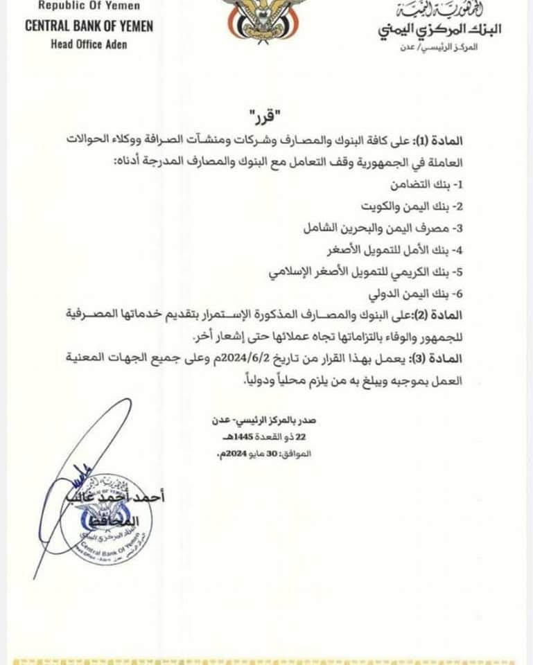 عــــاجل: قرار البنك المركزي في عدن بأيقاف التعامل مع ستة بنوك رئيسية 30 مايو 2024
