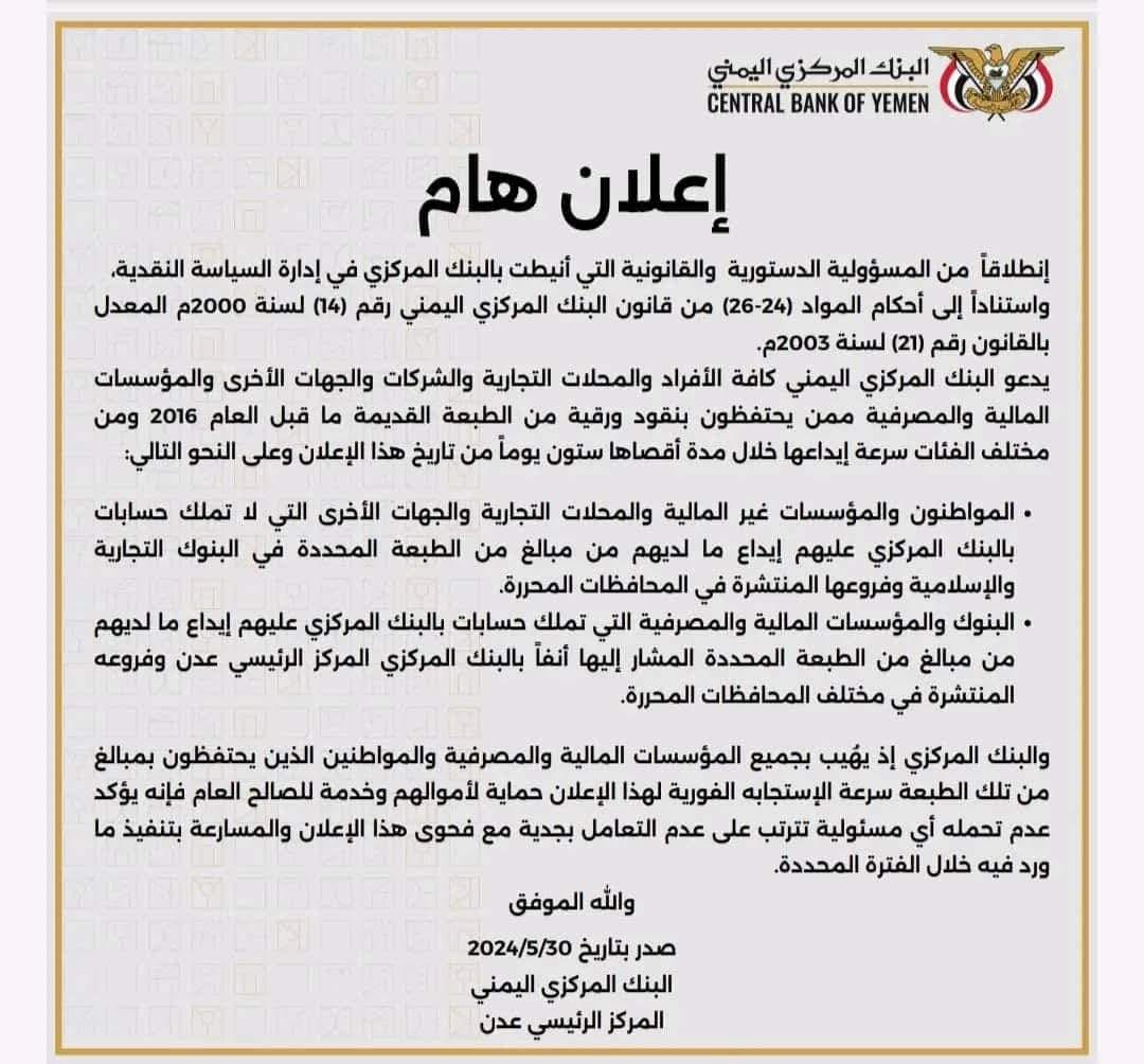 البنك المركزي يدعو إلى سرعة إيداع أي مبالغ “طبعة قديمة” خلال مدة أقصاها 60 يوماً 30 مايو 2024